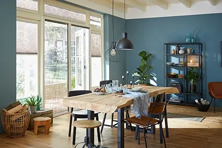 Teal brengt een gevoel van rust, verfijning en kracht in het interieur. Deze diepe blauwgroene tint straalt stabiliteit uit en voegt een kalme, mysterieuze sfeer toe aan elke ruimte. In combinatie met warme houttonen, zachte stoffen en natuurlijke structuren ontstaat een stijlvolle balans.